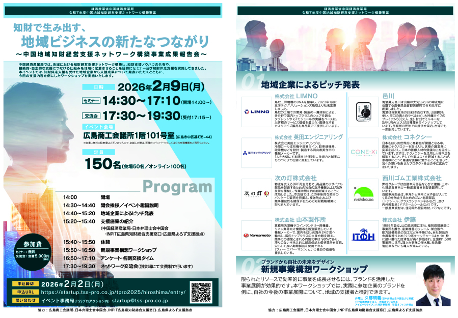 2026年2月9日、広島商工会議所にて開催された、経済産業省 中国経済産業局主催の「知財経営支援ネットワーク構築事業」成果報告会に参加いたしました。
