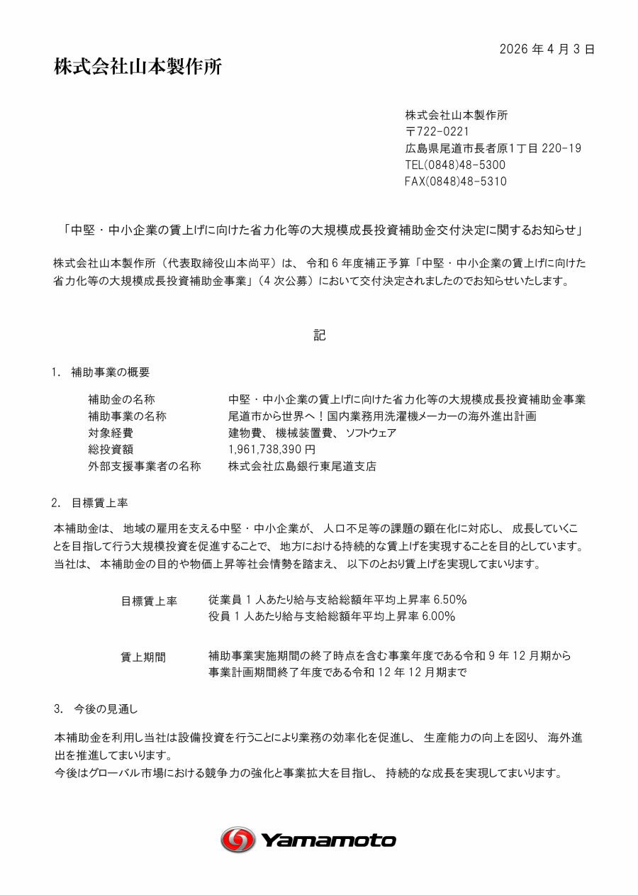 中堅・中小企業の賃上げに向けた省力化等の大規模成長投資補助金交付決定に関するお知らせ
